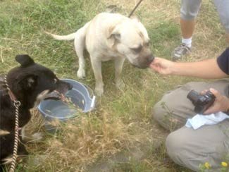 On Saturday I went back to South L.A. with Eldad, Normi and one other volunteer to try and capture the other three dogs. Since we already had the one and knew that the pittie girl wasn’t going to be caught without a trap, we set our goal on getting the other two – and we got them. It wasn’t hard really, just had to be careful no one got bitten as the dogs were stressed and not much in the mood to listen to us. After they were secured we had a chance to look closely at the rott mix, and thinking she is pregnant wanted to be very careful with her. But we came to the conclusion that we believe she has a very large growth mass in her belly area, the vet will let us know soon as they will be going there to be fixed, treated for parasites, sots and whatever else they may need.