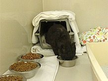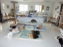 Yes, that just about sums it up for this cat. See, he was abandoned on the street when his owner died; neighbors had been feeding him, but the old family wanted him gone. Off to the shelter was his next step, but in stepped a very resourceful rescue person who found Smokey a wonderful place to stay, funded his transport, vet check ups, everything. I picked him up at his former dwelling, still sitting there waiting for his caregiver to return. So sad. We loaded him up and had an uneventful drive to the northern California rescue. Smokey was a little scared with all the sudden changes, as any cat would be, but once inside he settled right in. He will be in isolation for about 2 weeks then he can join the general population as one of the crew. So deserving, so lucky.